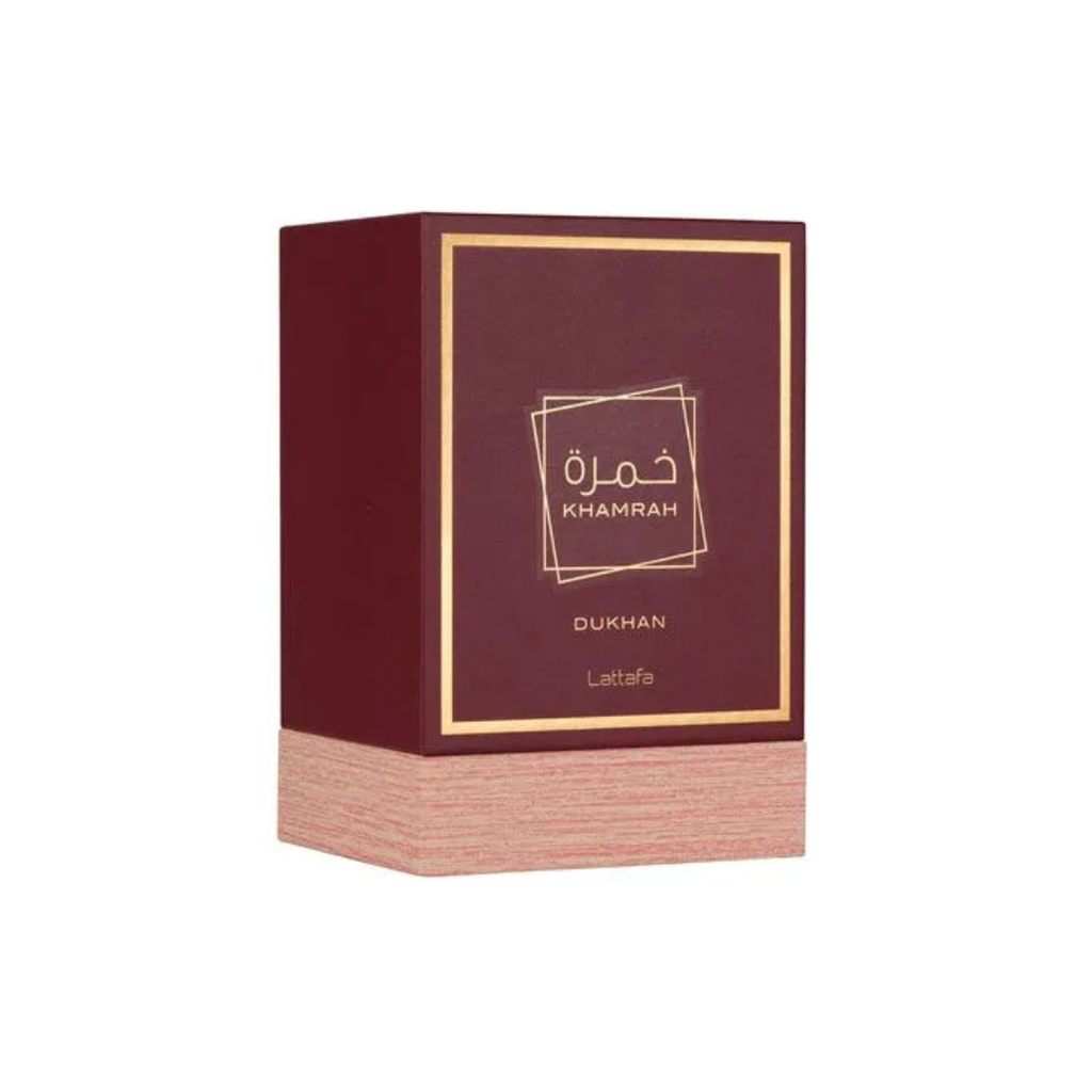 O Lattafa Khamrah Dukhan Eau de Parfum - Perfume Unissex 100ml é uma fragrância da renomada marca de Dubai, Lattafa Perfumes, pertencente à família olfativa Amadeirada Oriental.